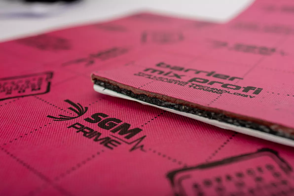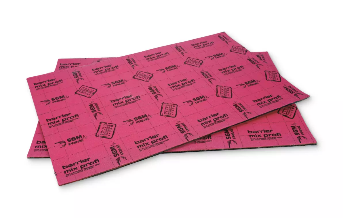 SGM Prime Barrier Mix Profi — cel mai eficient material membranar premium din gama SGM Prime, format dintr-o structură multistrat: spumă cu celule deschise, expandată secundar, cu adaos de cauciuc expandat și adaos de latex, membrană de amortizare a vibrațiilor cu grosimea de 4 mm și bază adezivă masticată cu hârtie de protecție siliconată. Materialul demonstrează o eficiență record în suprimarea zgomotelor, păstrând în același timp o flexibilitate excepțională și o ușurință de montare.